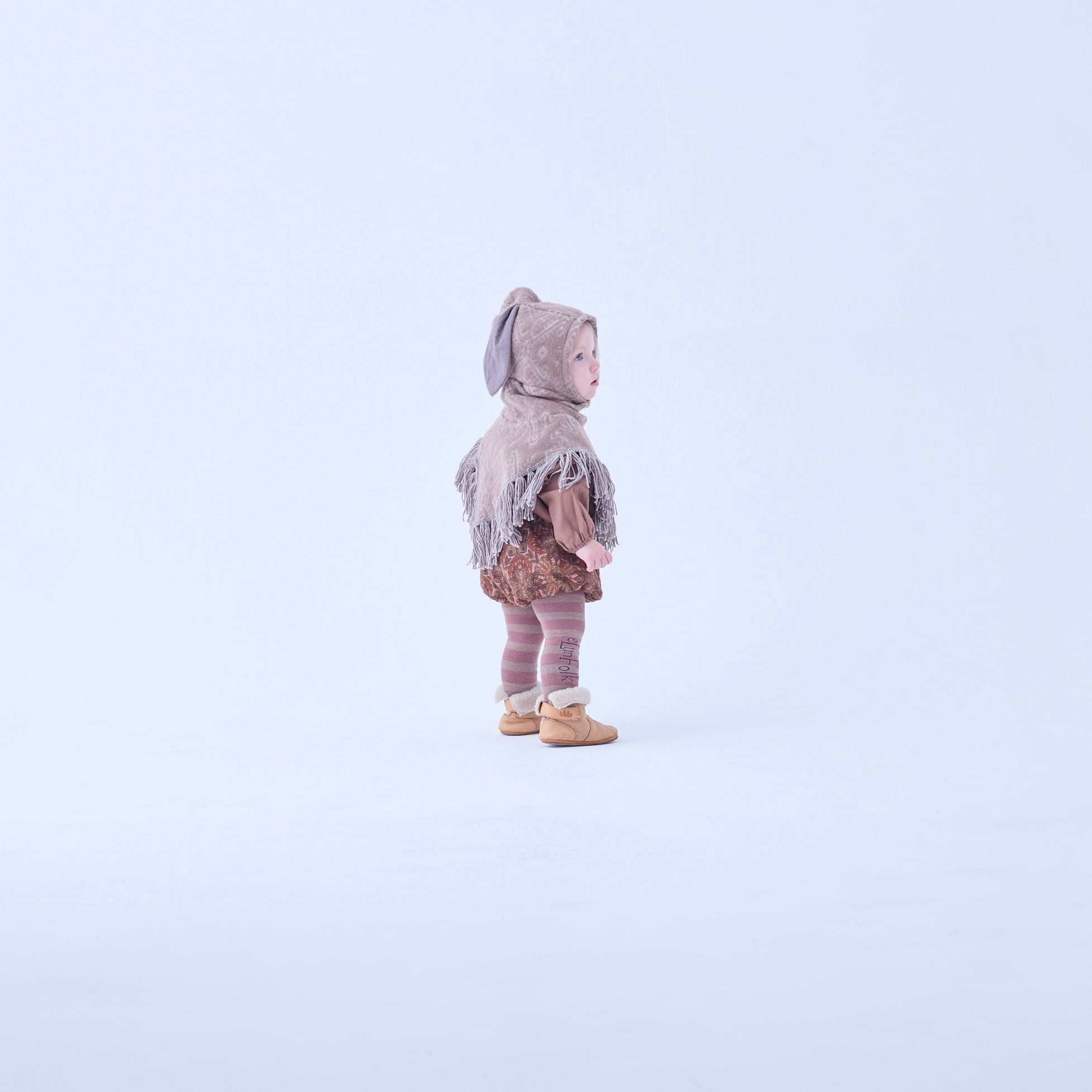 雪の結晶柄を元にオリジナルジャガードにしたふわふわなテキスタイルのフリンジケープ&バニーボンネット、マフラー、新デザインのニットマント&ビーニーなどノスタルジックなコーディネートが楽しめるコレクションです!