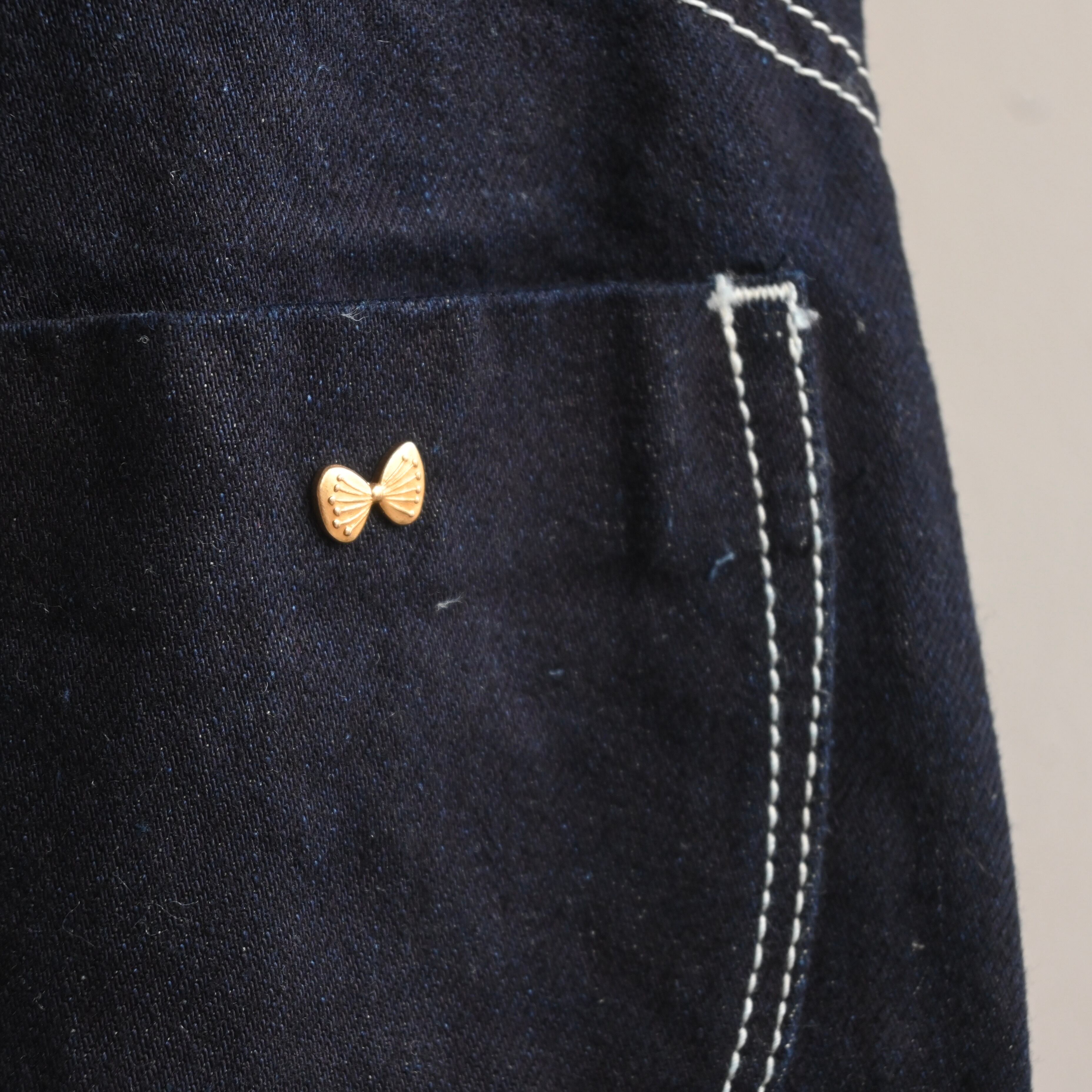 ちょうちょの刻印がされたボタンやポケットのさりげないちょうちょなど細かな遊び心も◎