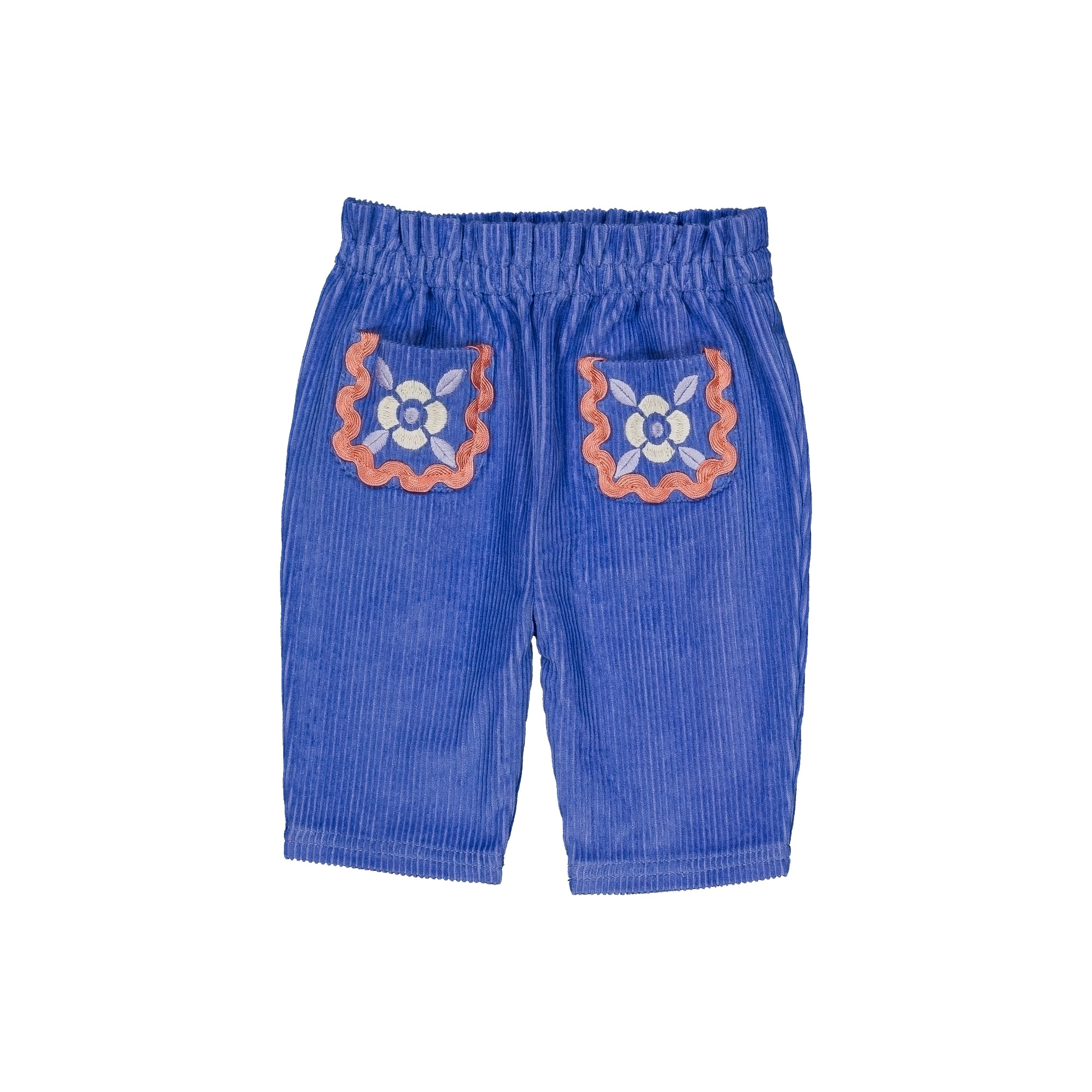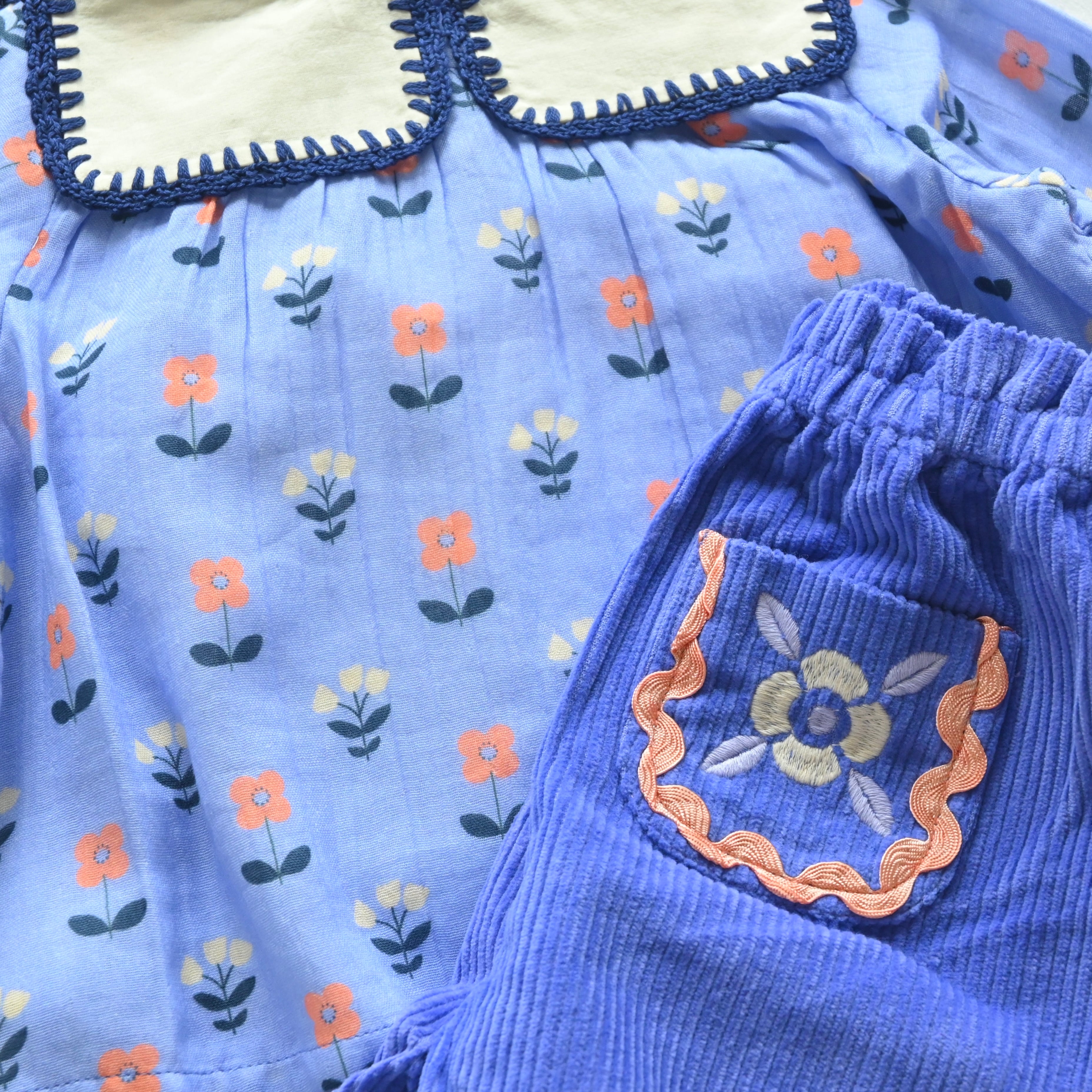 ポケットのお花の刺繍とリックラックがアクセントに♪