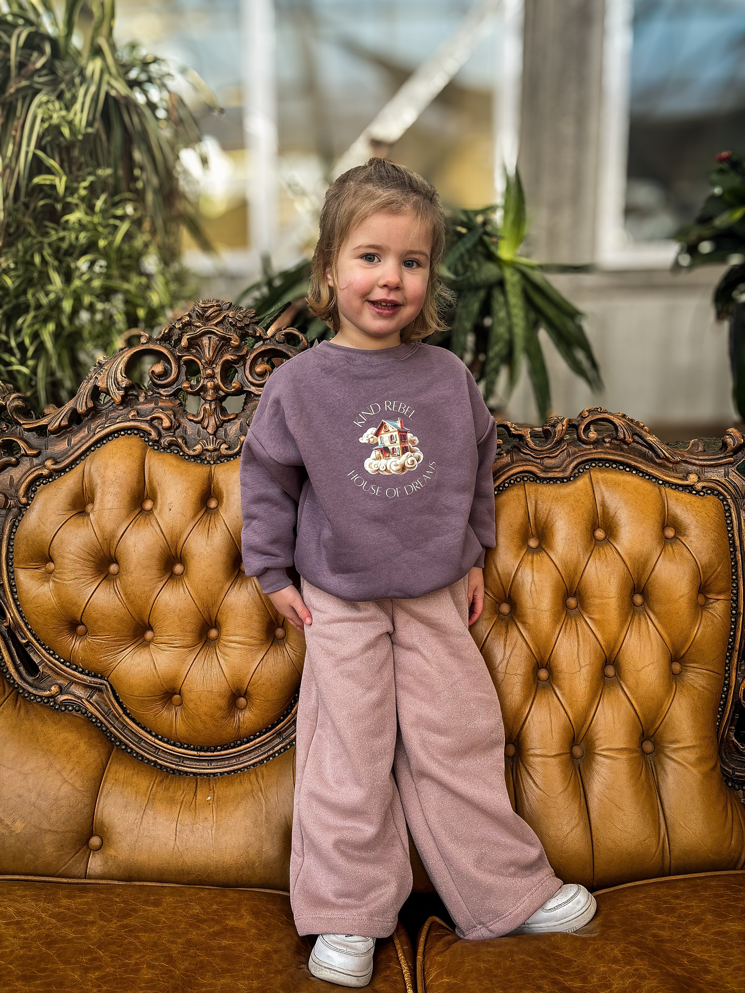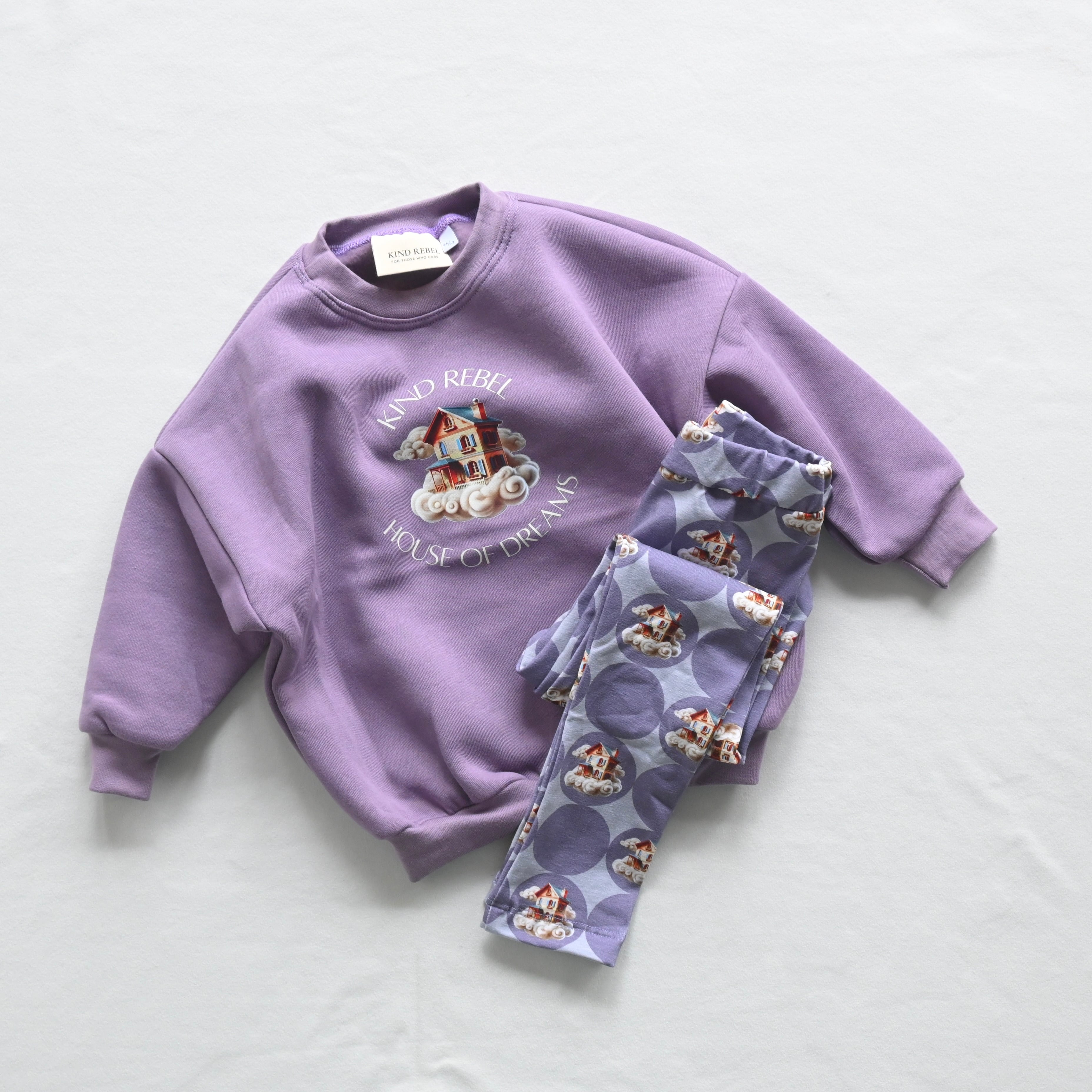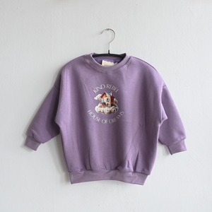 グレイッシュパープルの生地にの雲の上のお家プリントが目を惹きます。