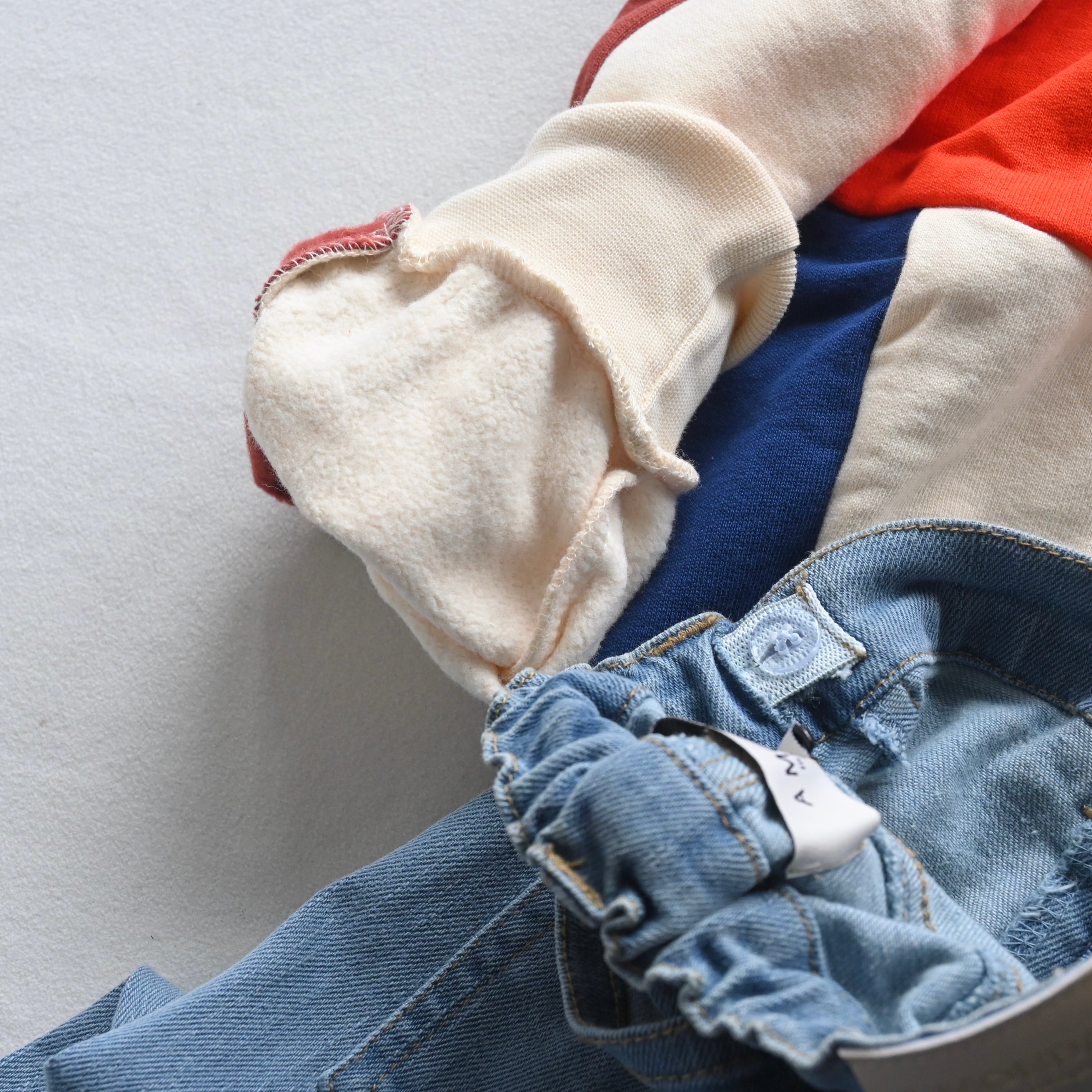 デニムパンツは一つあるとコーデに万能です。スリムなシルエットでウエストアジャスター付き。