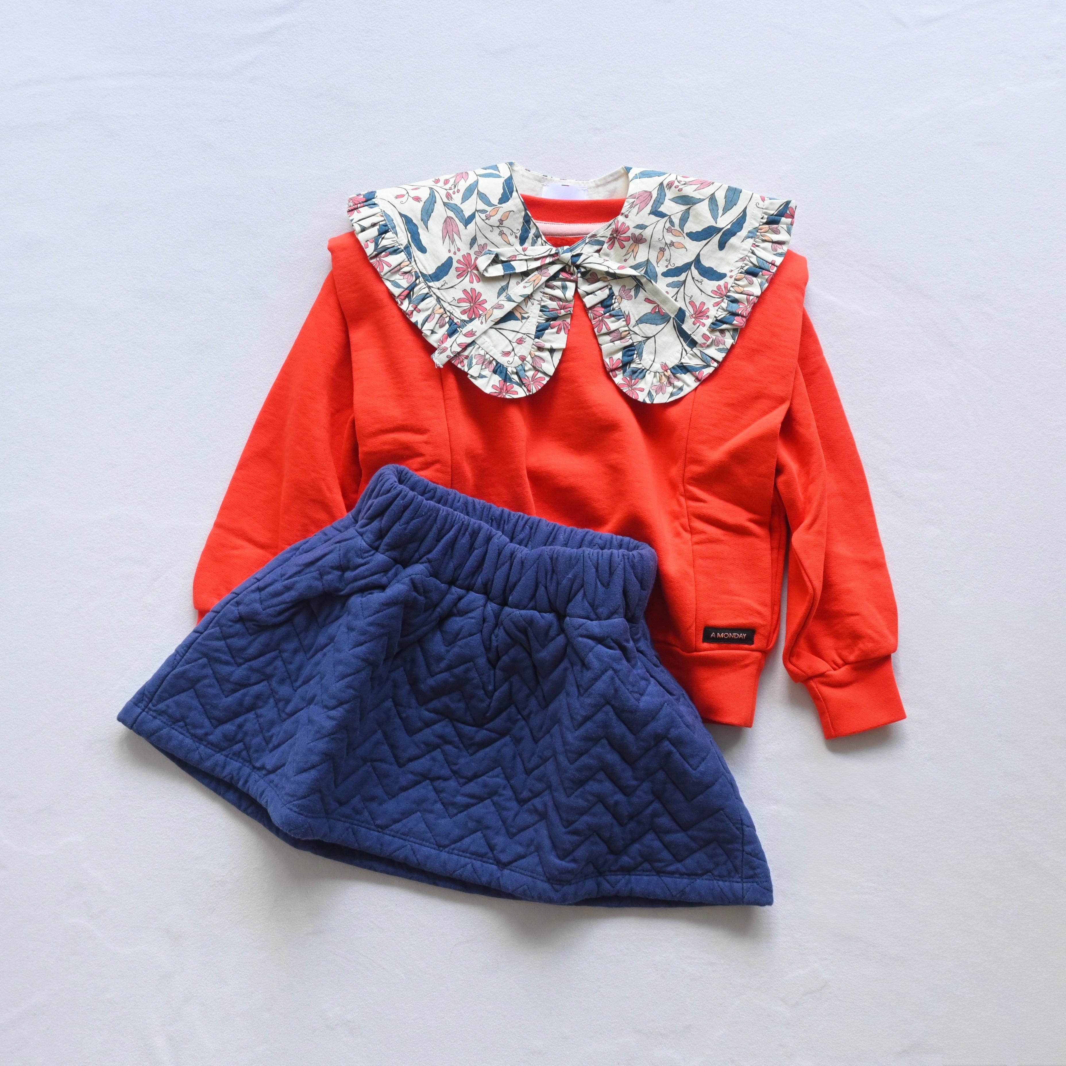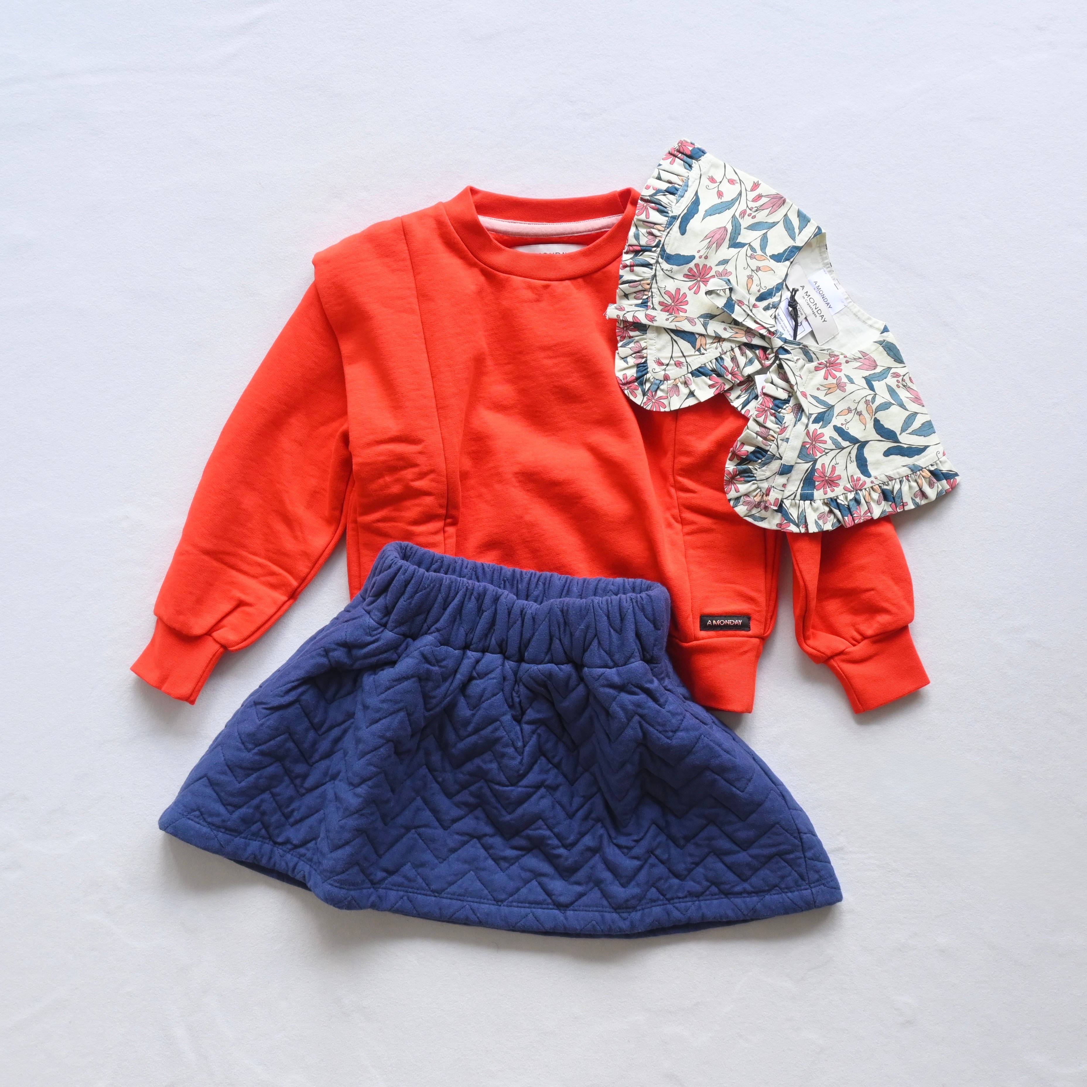 鮮やかなレッドスウェットにボリューミーなキルティングスカート。