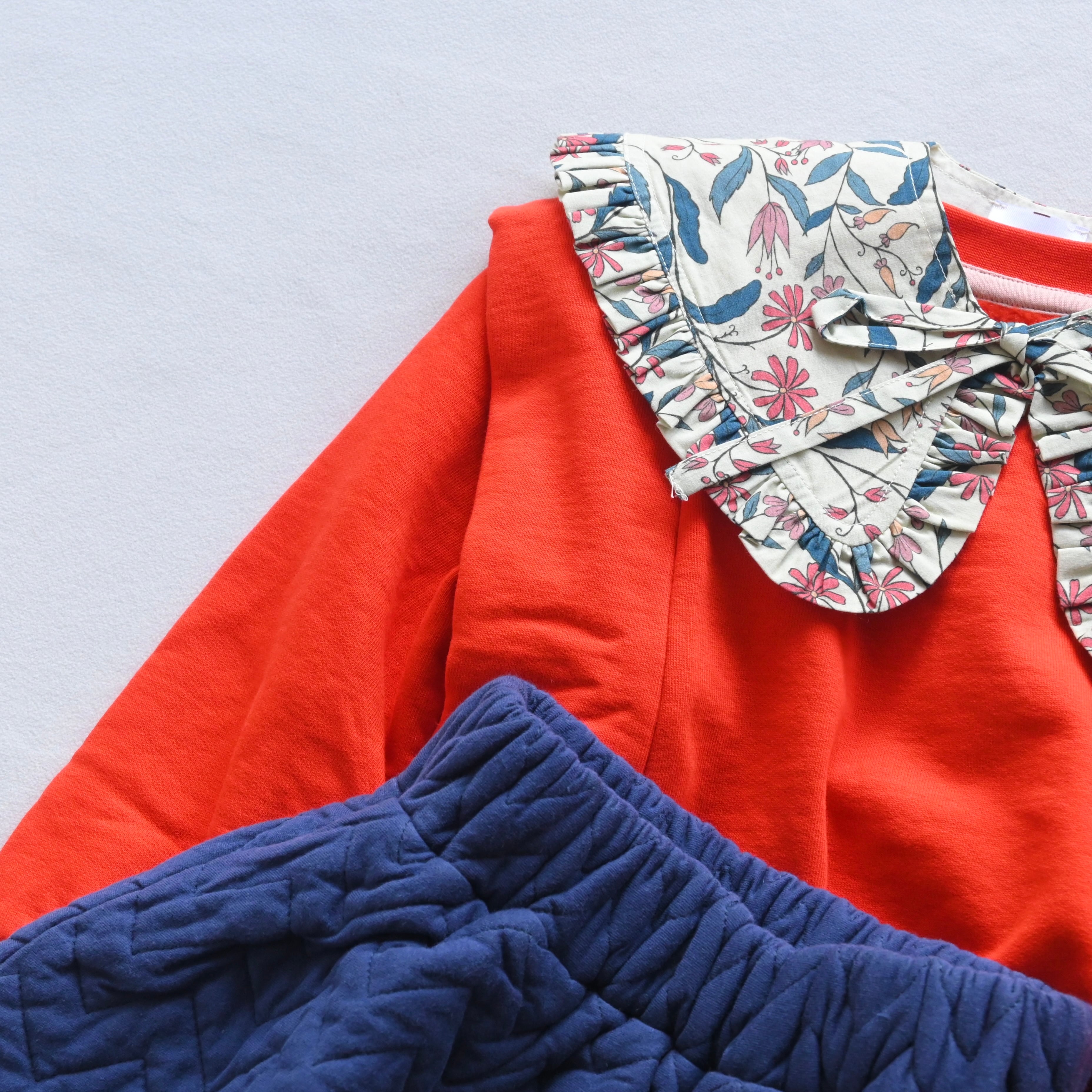 ビビッドなコーデにフラワー柄のつけ襟がアクセントに効きます♪