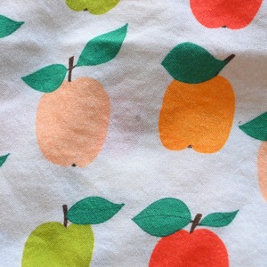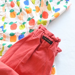レトロなアプル柄Aラインブラウスとチェリーのような発色のパンツ。