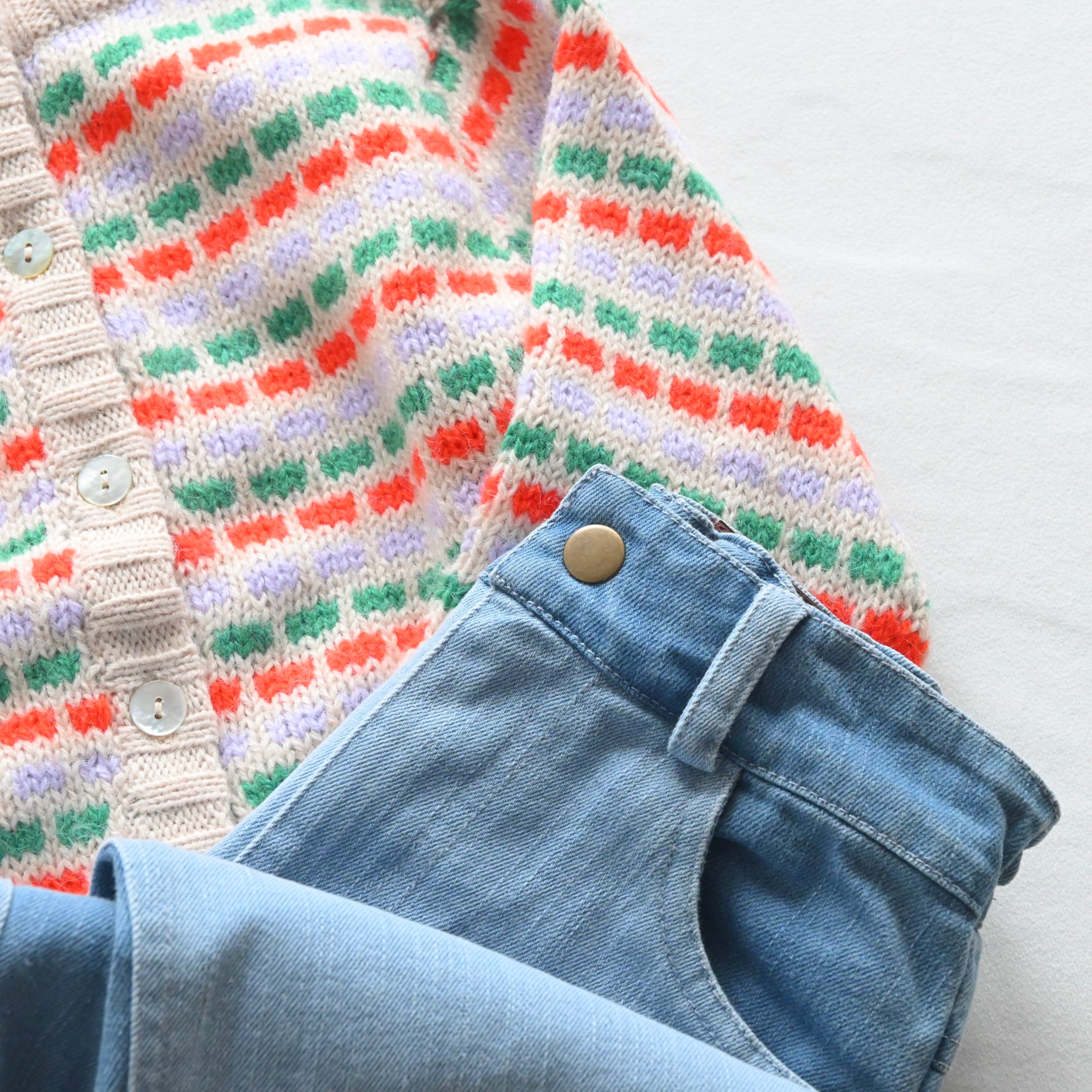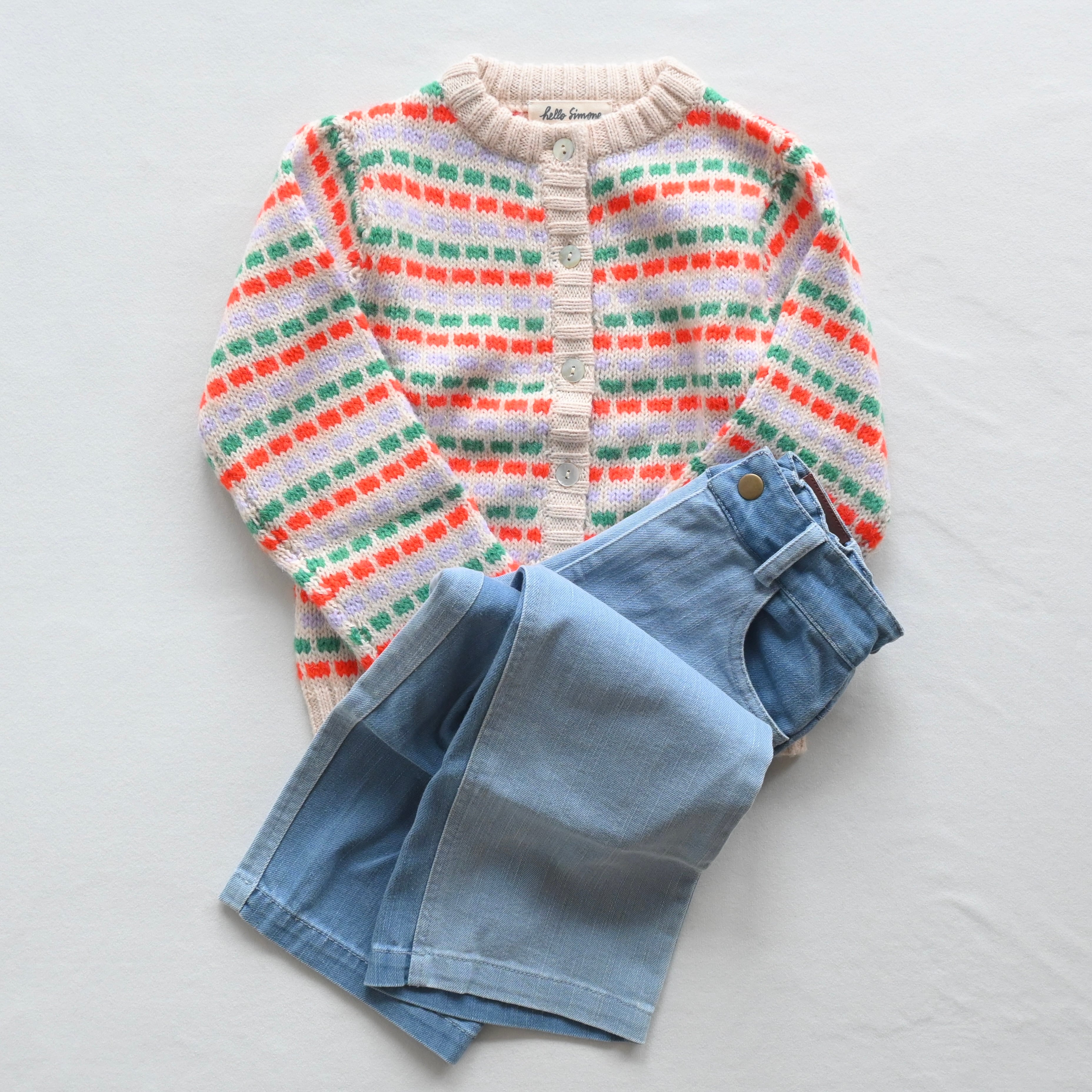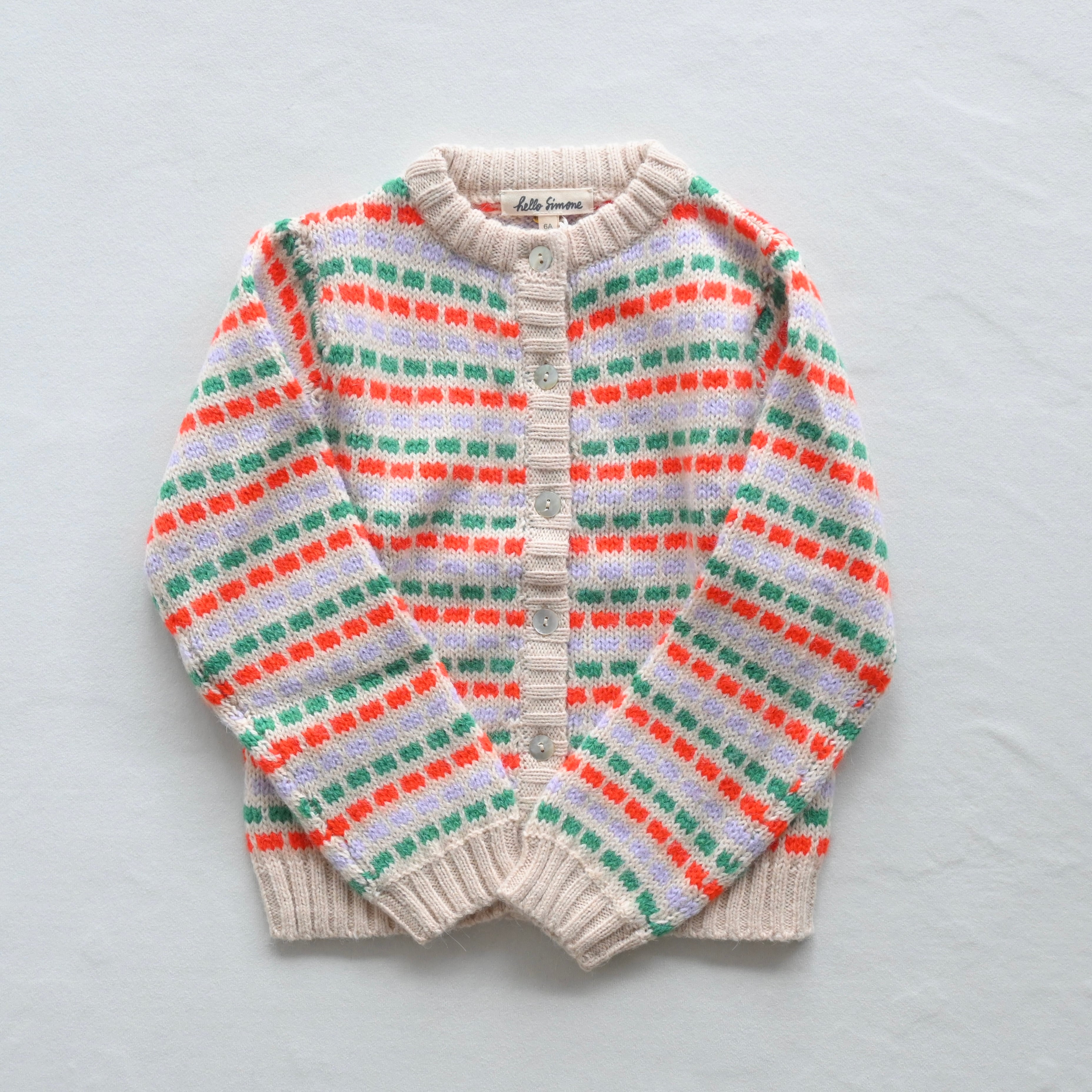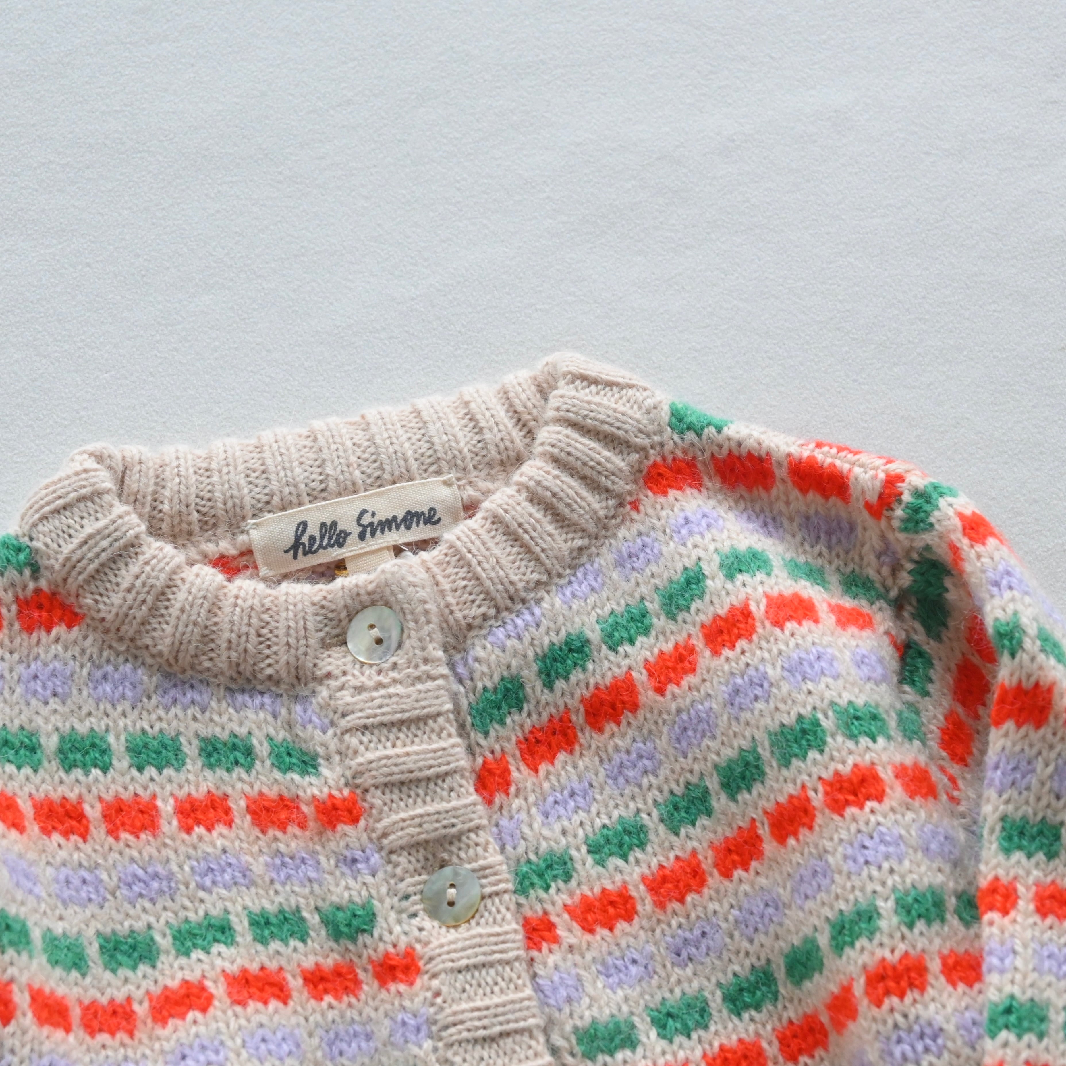 カラフルなジャガード編みのニットカーディガンはふわふわ。