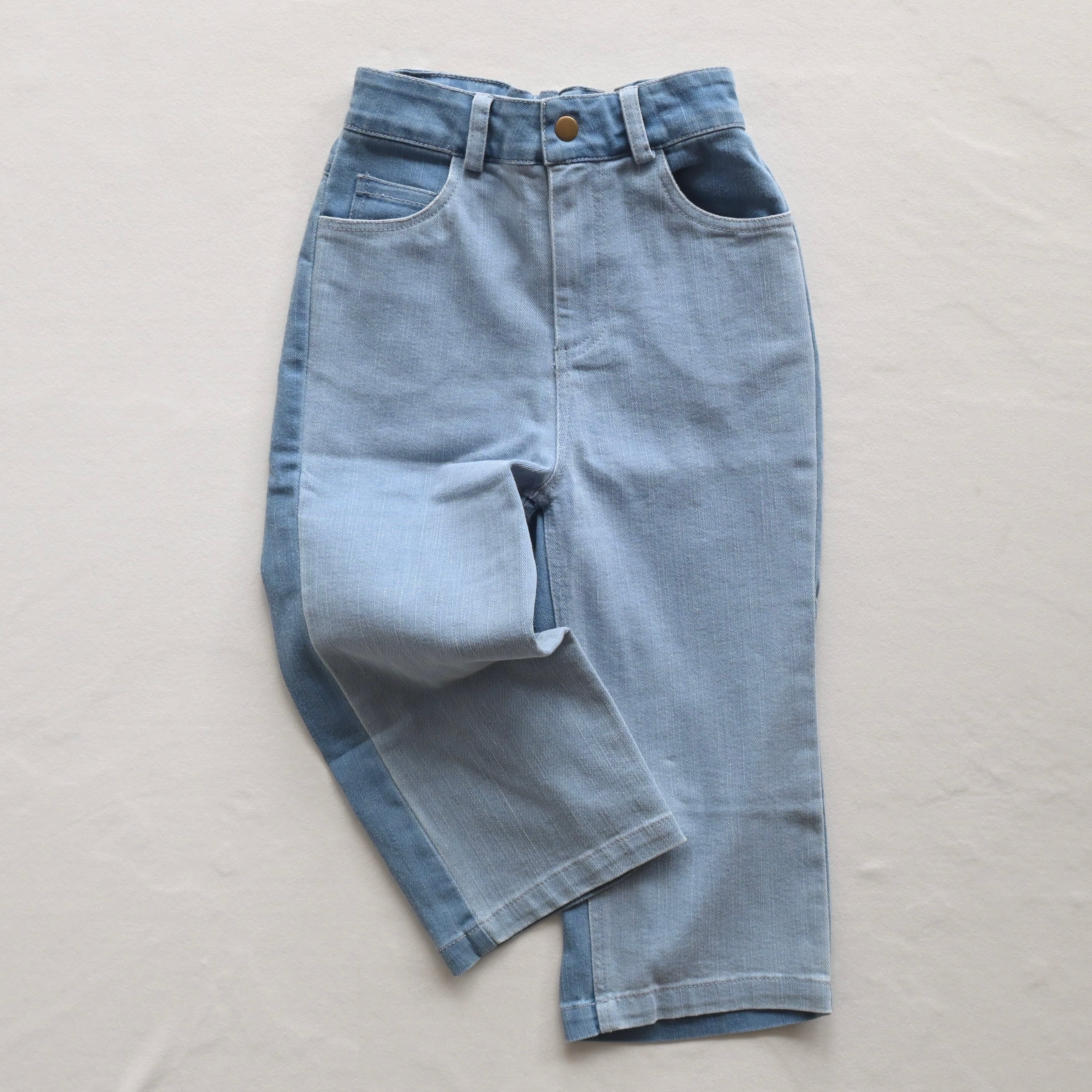 濃淡2色の切り替えがかわいいデニムパンツは裾に向かって広がるフレアシルエット!