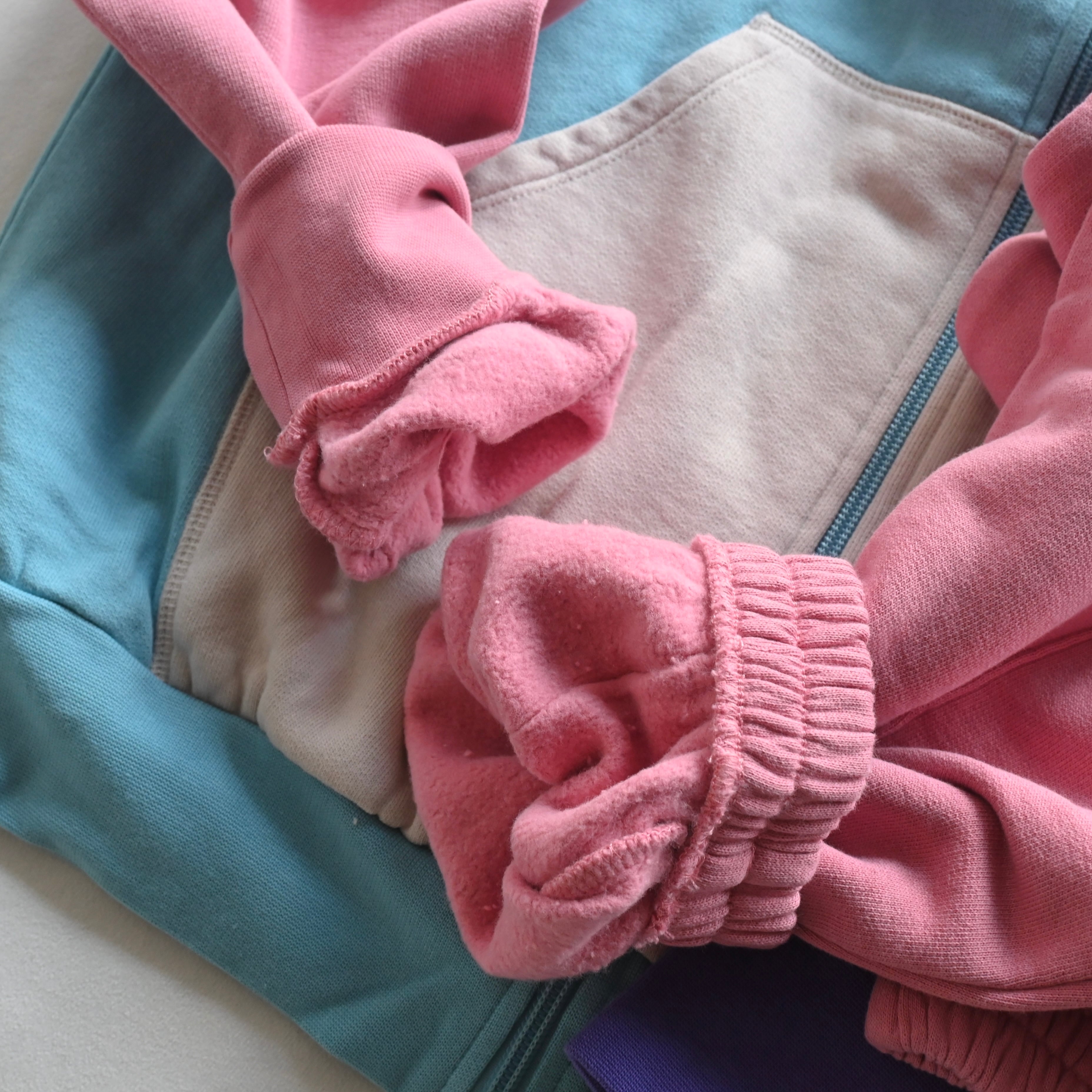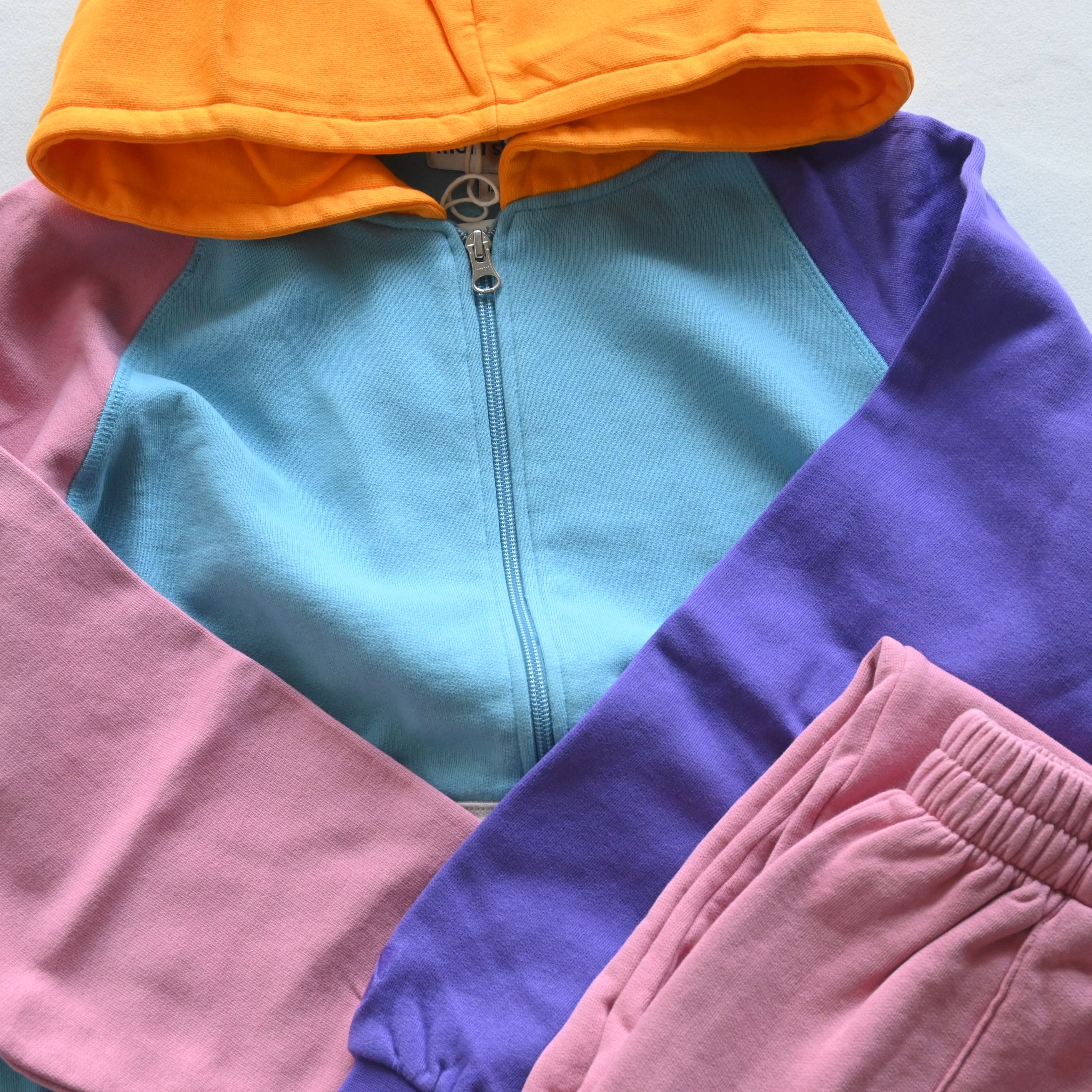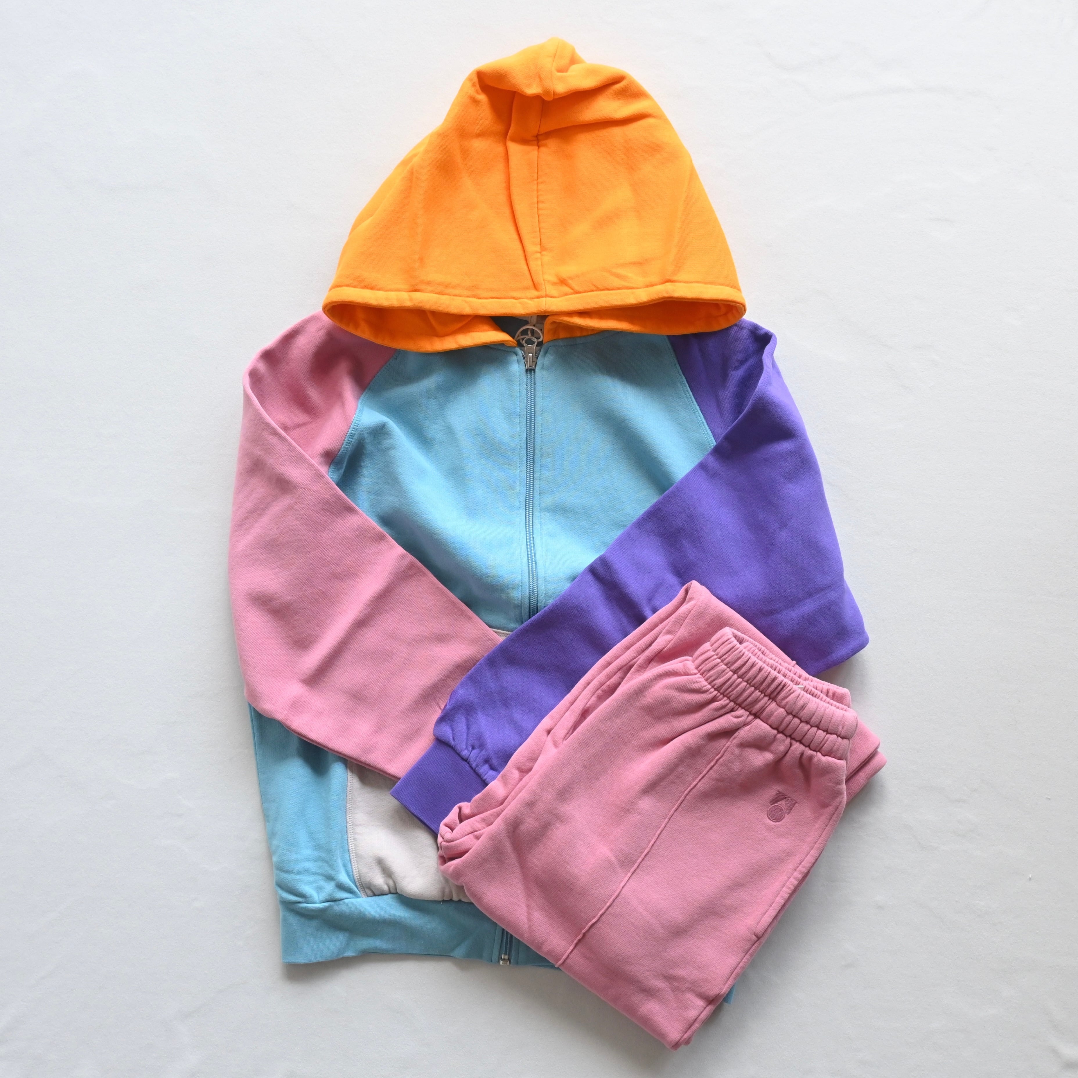 カラーブロッキングフーディに冒険カラーピンクのスウェットパンツ。