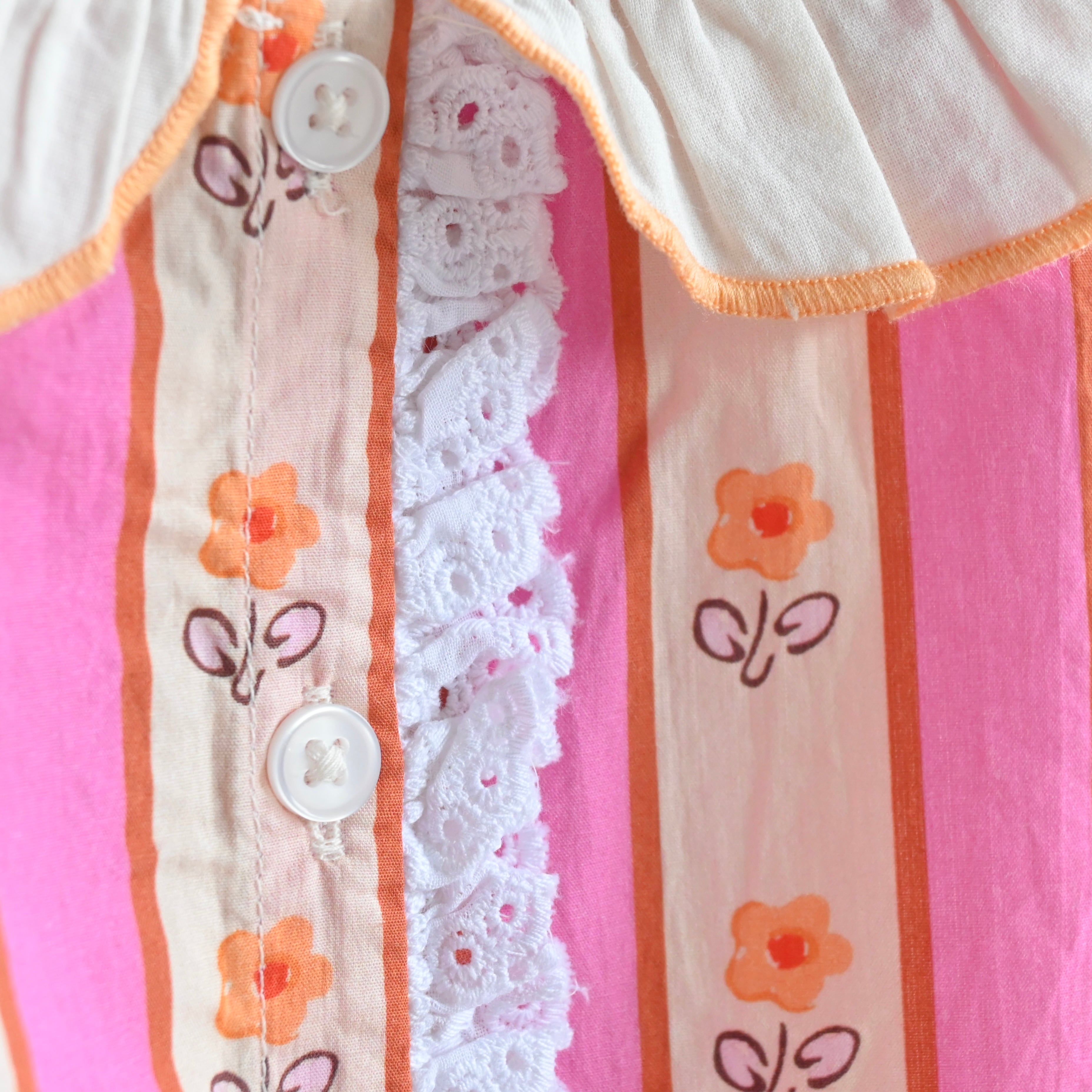 鮮やかなピンクにヴィンテージライクなフラワー柄ラインのストライプ。