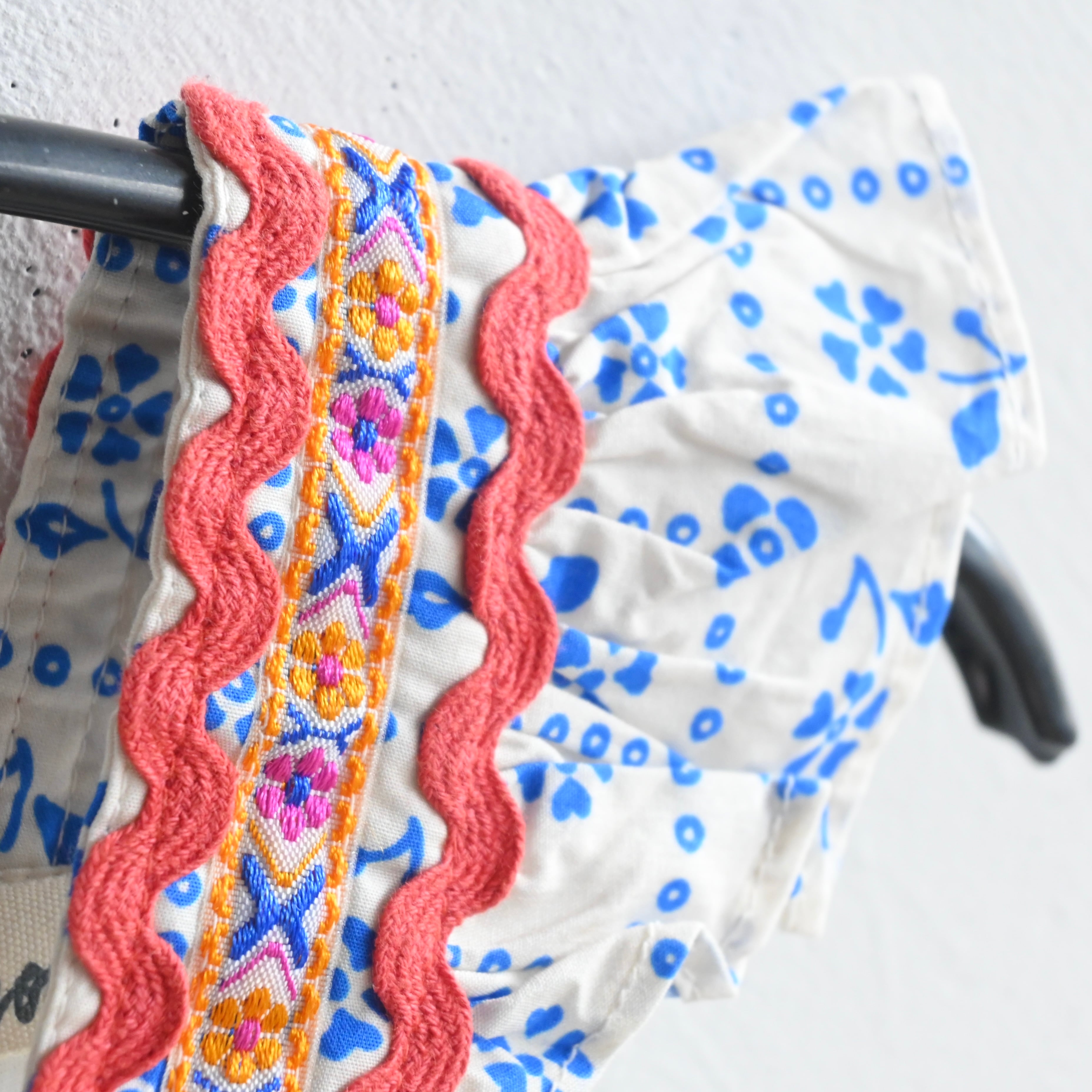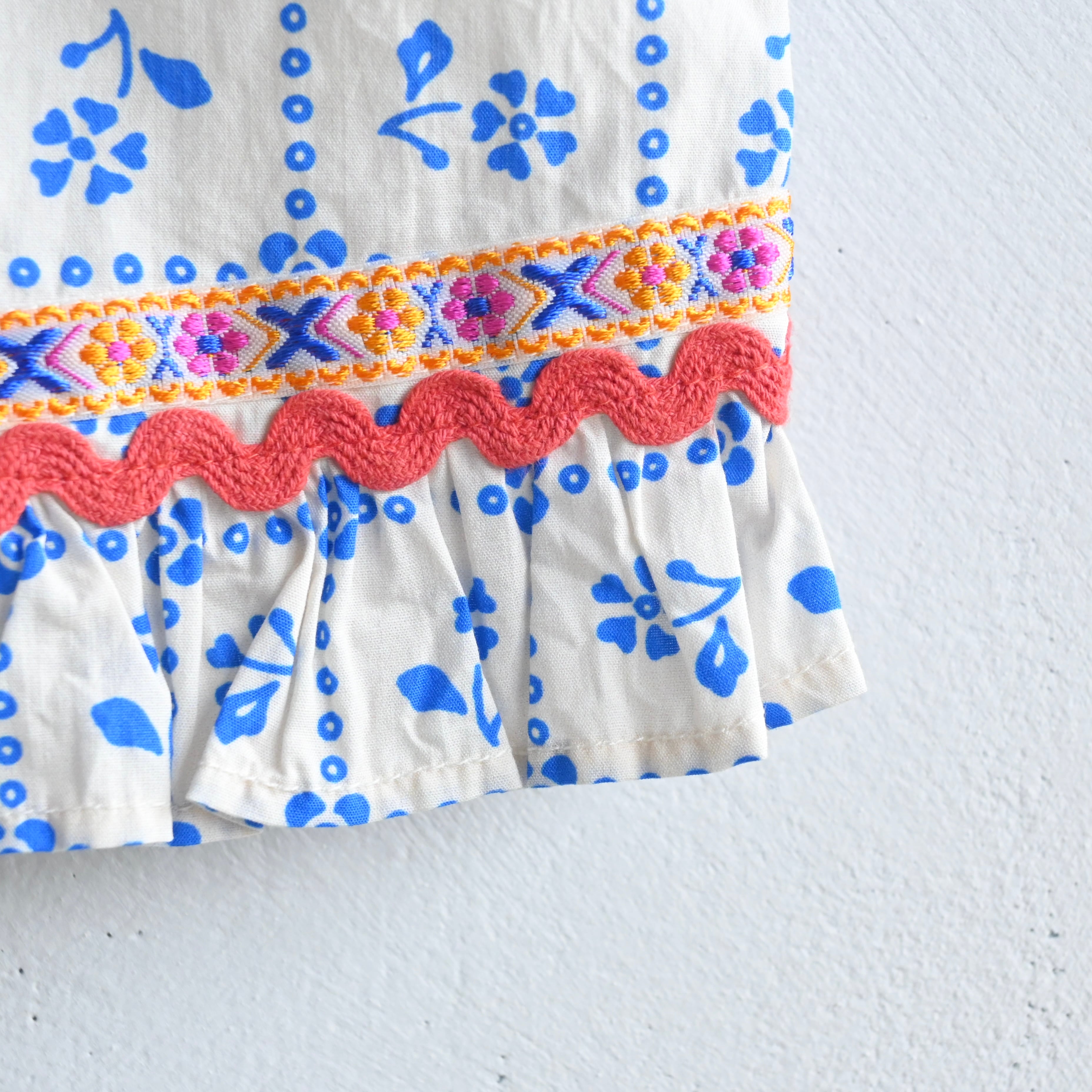 フラワー刺繍とリクラックが目を惹き、どこかプロバンスの民族衣装を思わせます。