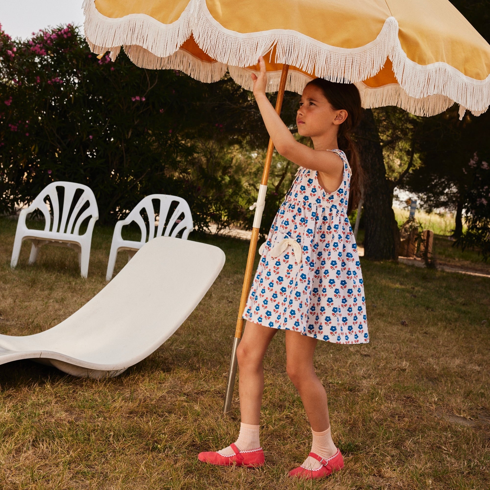 くるくると舞うワンピース、軽快なスタイル、髪を彩る小さなアクセサリー——