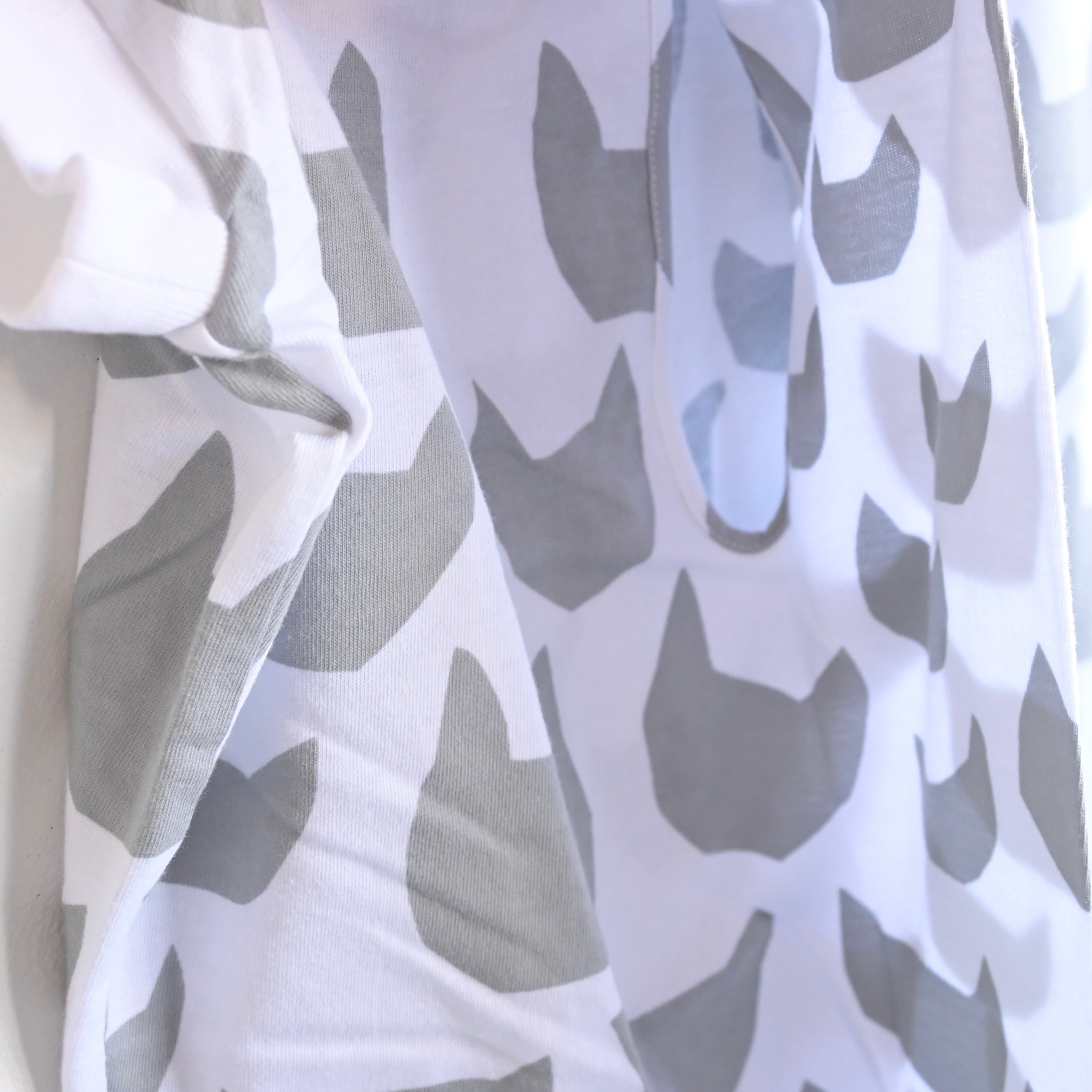 ホワイト生地にグレーのイラストが爽やか。羽織りも加えやすい万能な発色です。