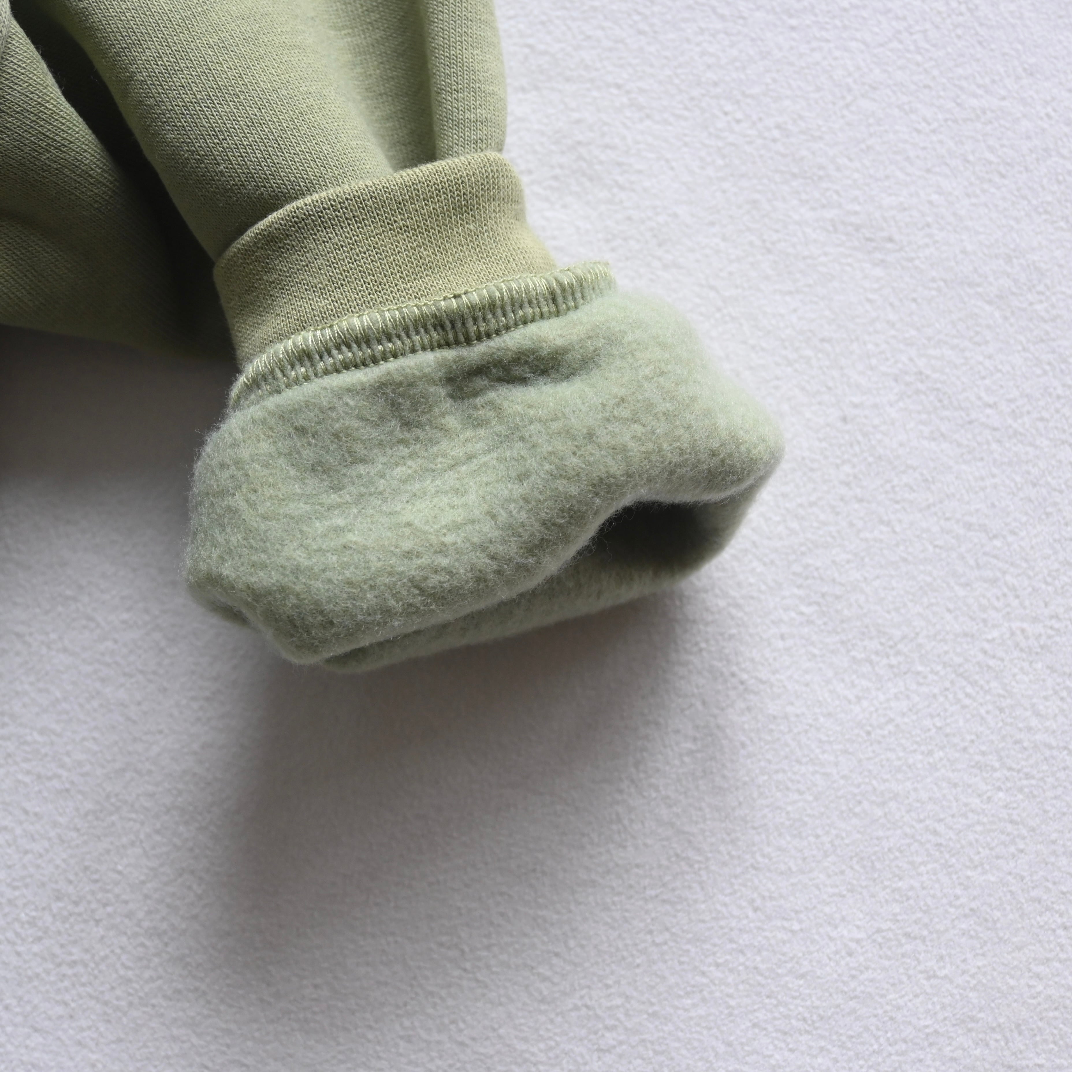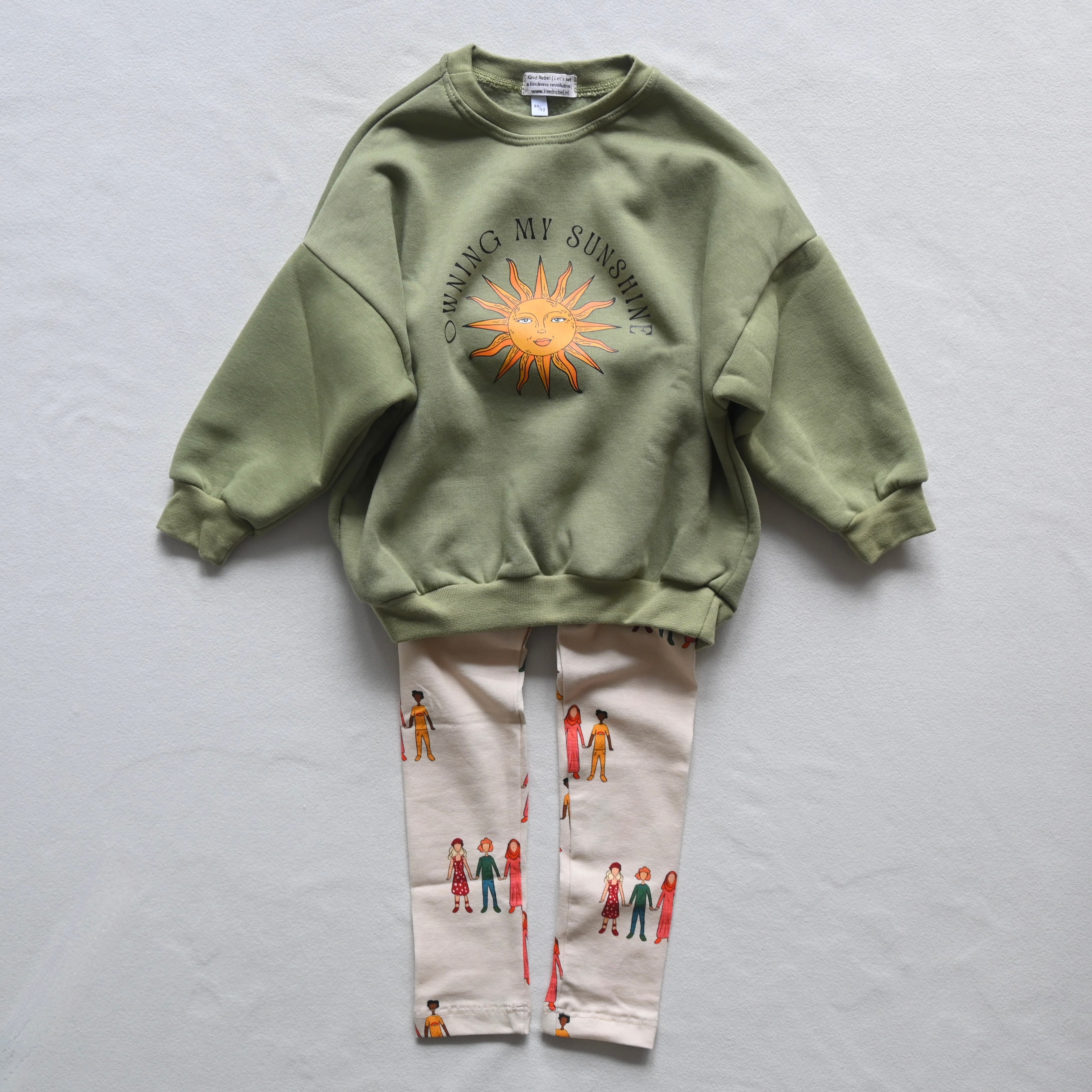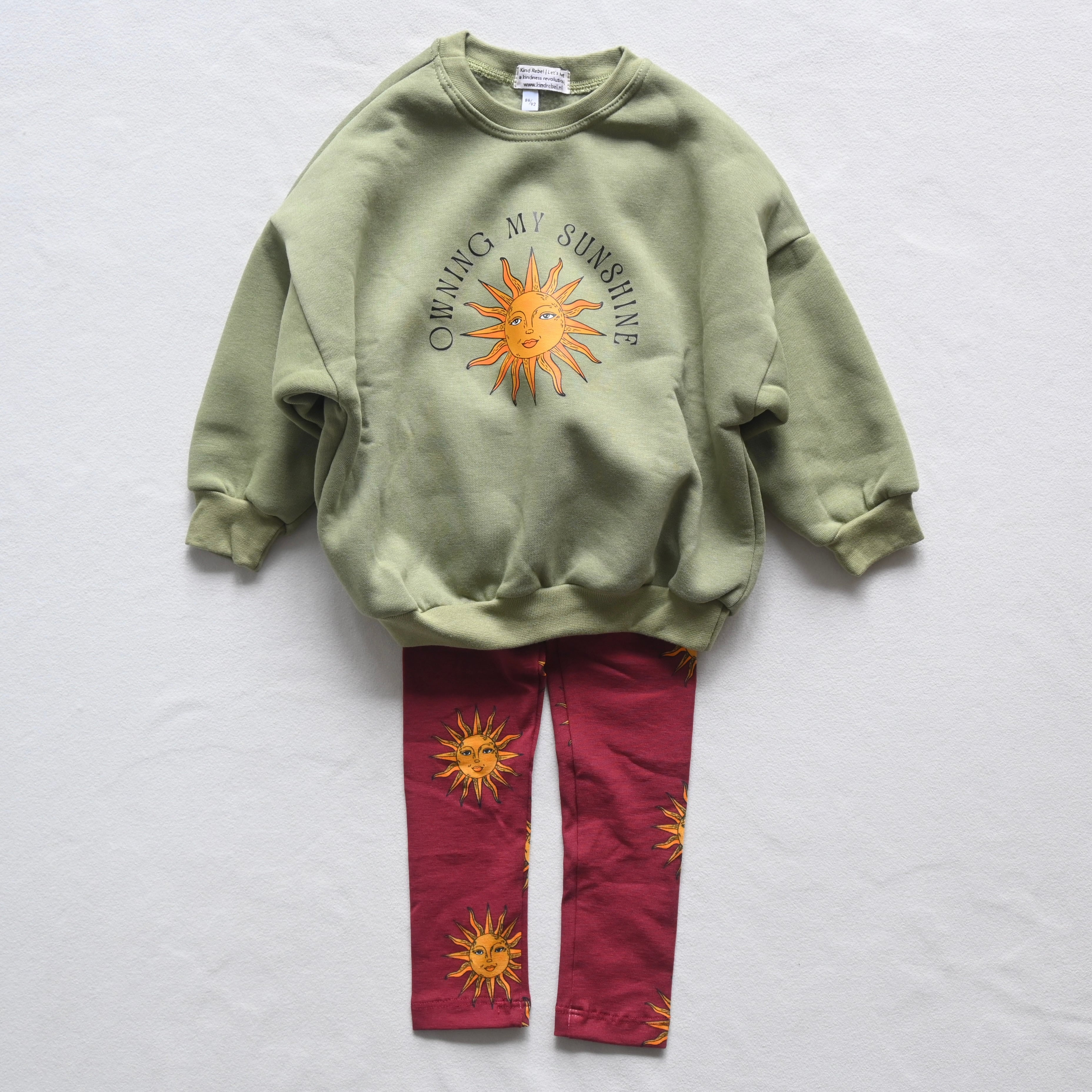 セージグリーンの生地にユニークな太陽イラストが映えるノスタルジックな1着。